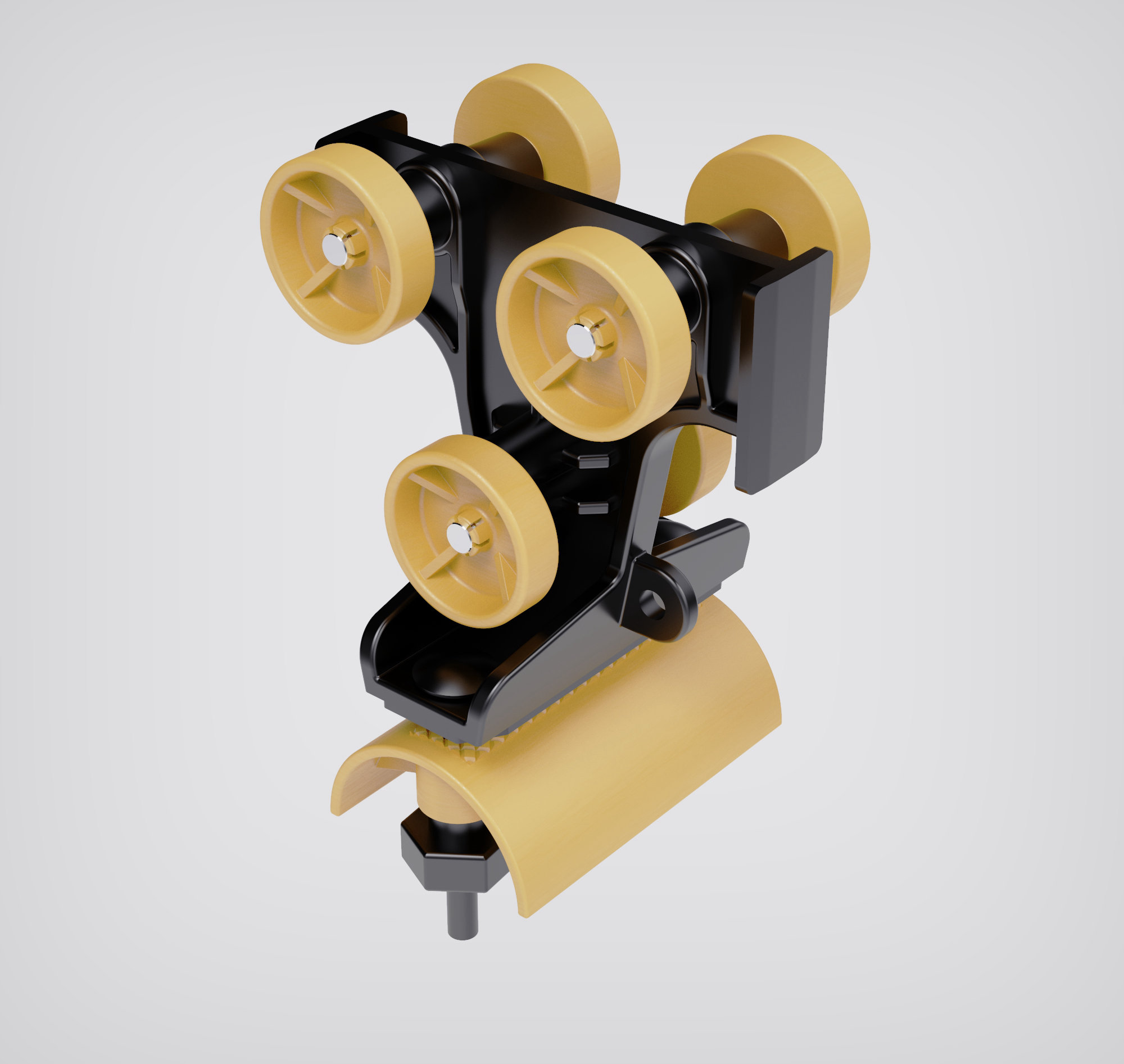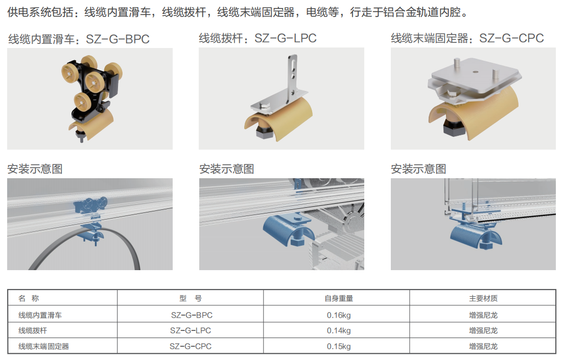 供电系统包括:线缆内置滑车,线缆拨杆,线缆末端固定器,电缆等,行走于铝合金轨道内腔。